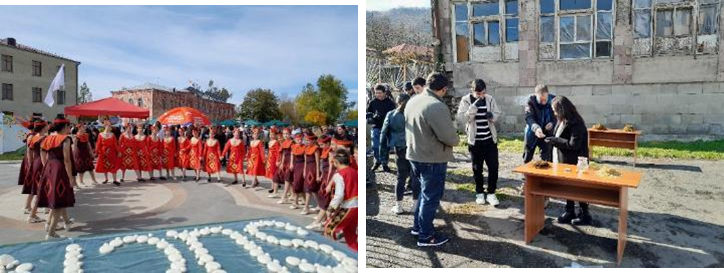 Donnerstag: Die Seilbahnfahrt zum Tatev Kloster zeigt einen atemberaubenden Blick in die Schlucht des Vorotan. Das Kloster baute über Jahrhunde eine reichhaltige Bibliothek der armenischen Kirche auf. Das Kloster wurde zu Beginn der Sowjetunion geschlossen. Heute wird seine Kirche wieder genutzt. An den Marktständen verkaufen die Dorffrauen ihre feine Gatas (ähnlich der Bündner Nusstorte), Sudjukh (auf einen Faden aufgezogene Baumnüsse umhüllt mit Traubengelee), getrocknete Früchte und Teekräuter. In Sisian besuchen wir anschliessend einen kleinen Praktikumsbetrieb der hiesigen Berufsschule sowie eine Genossenschaft, die sich intensiv mit Pflanzenzucht beschäftigt. Sie sind Teil des HEKS-Projektes, das den landwirtschaftlichen Sektor stärkt, indem eine duale Ausbildung nach Schweizer Vorbild für Landwirt:innen aufgebaut wird. Vorbei an Zorats Karer (dem ‘armenischen Stonehenge’) fahren wir zurück in die Weinregion. Wir besuchen eine Weinbauernfamilie und lassen uns den ausgezeichneten armenischen Wein munden. Übernachtung im Hotel Arevi im abgelegenen Yeghegis Tal, wo schon Bären vor dem Hotel gesichtet wurden.